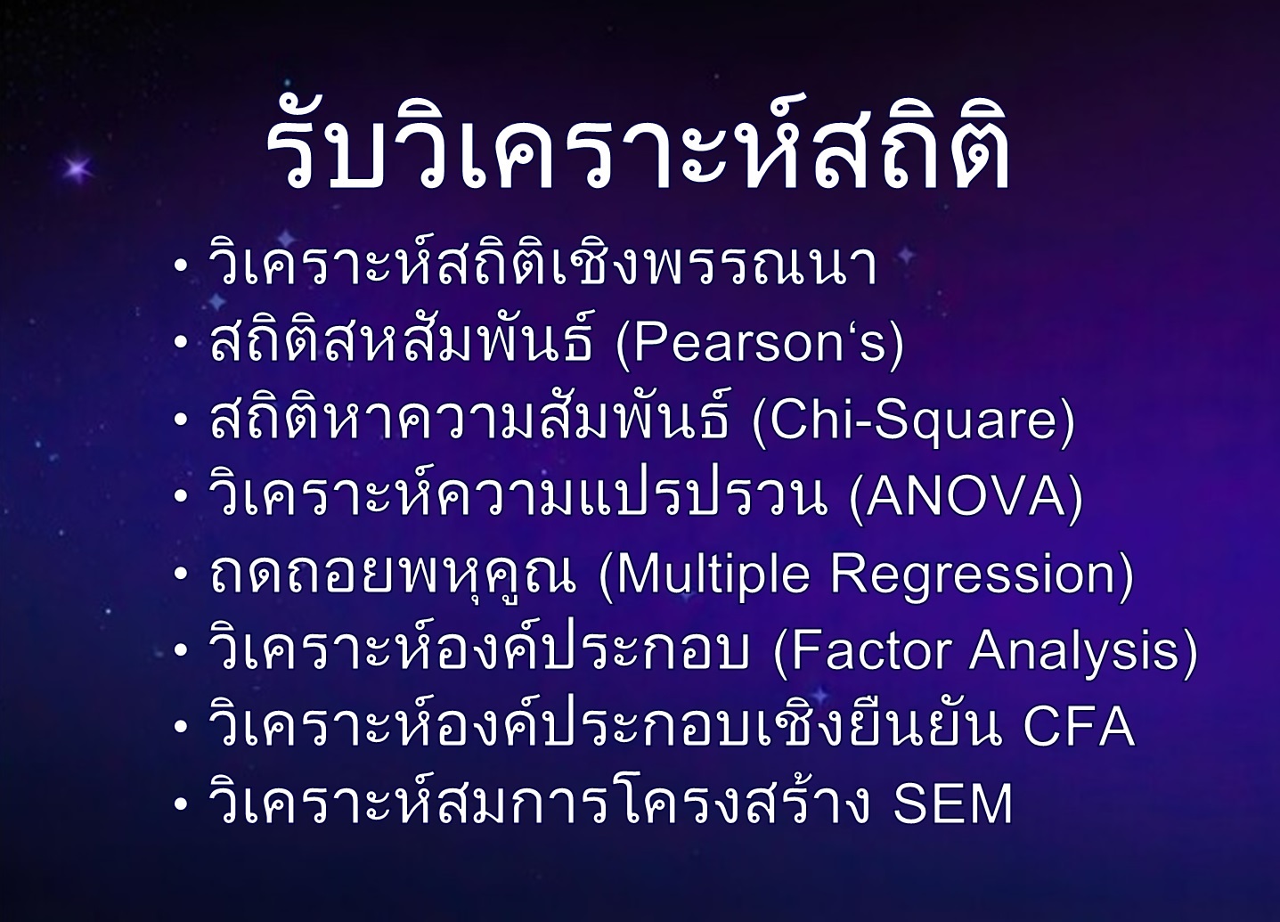 รับทำวิจัยระดับปริญญาโท รับทำวิทยานิพนธ์(ที่ปรึกษา) รับวิเคราะห์ข้อมูลทางสถิติ รับทำปัญหาพิเศษ และ ค้นคว้าอิสระ โดยใช้โปรแกรมวิเคราะห์ข้อมูลทางสถิติ SPSS, STATA, Mplus, EViews, AMOS และ LISREL เพื่อให้ผลงานมีความถูกต้อง สมบูรณ์ และมีคุณภาพในระดับมาตรฐานทางวิชาการ